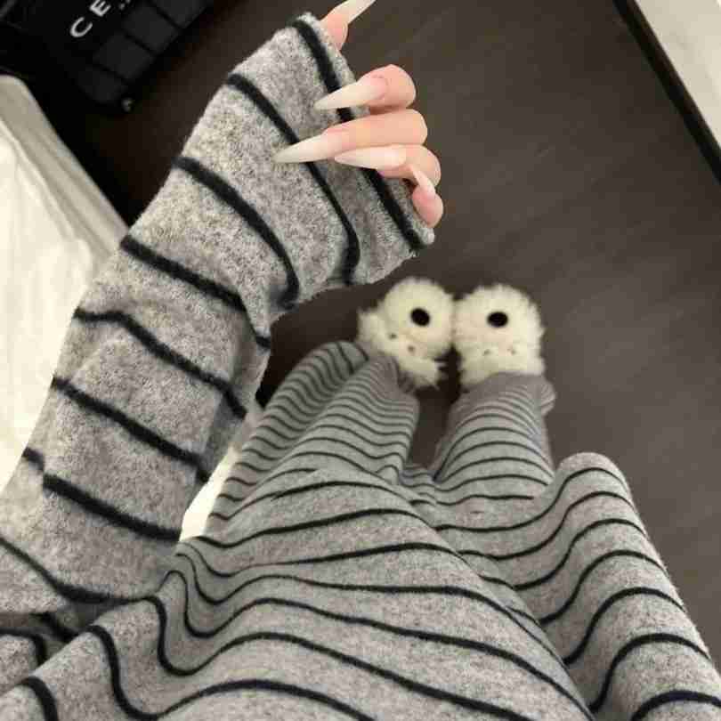💰29.9包邮‼️工厂清仓‼️‼️随时下架‼️韩系松弛感💯 灰色条纹德绒睡衣套装 | 秋冬保暖刚需❗️